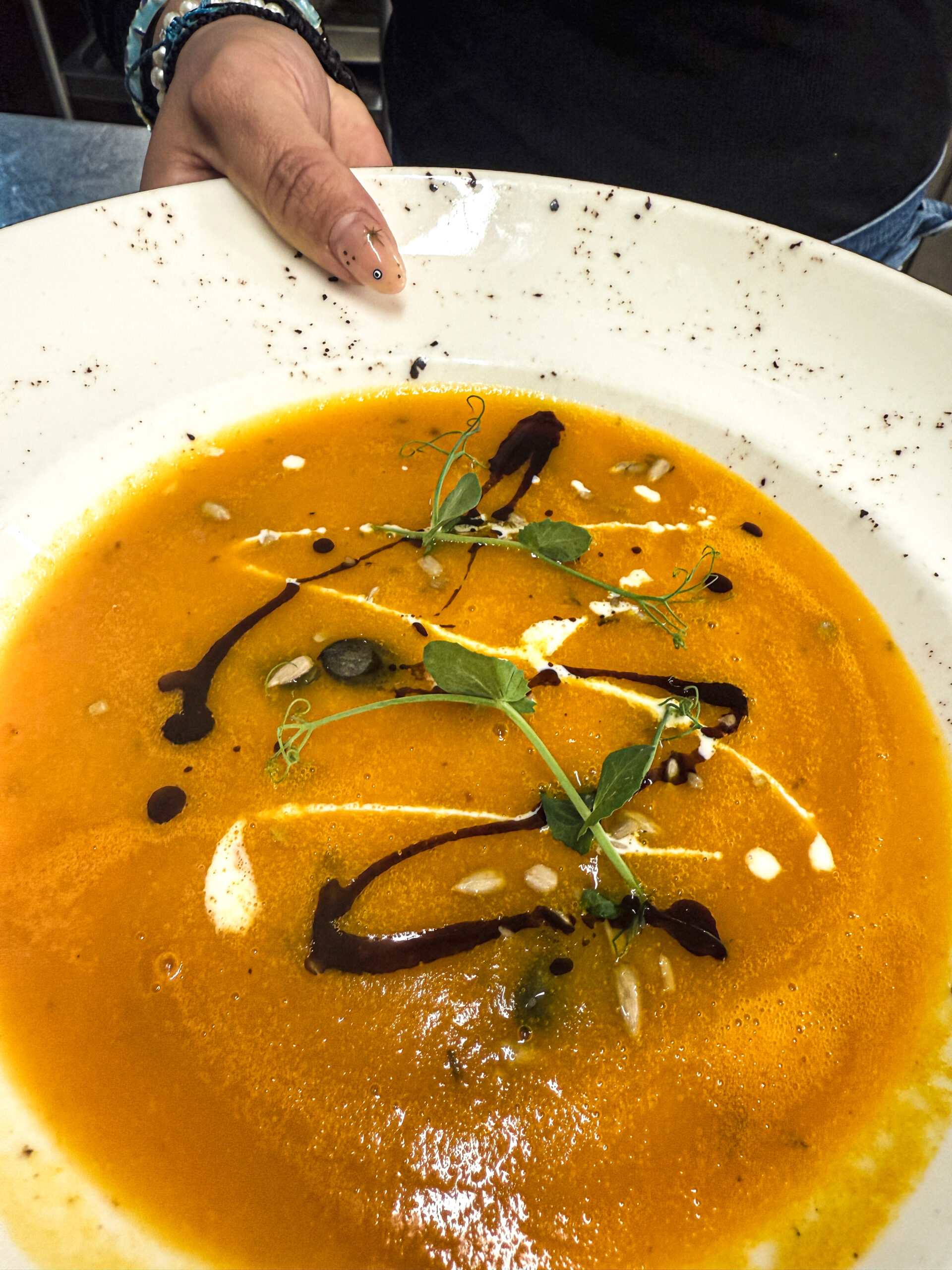 Rieslingrahm / Kräuteröl / Spinat / Wurzelgemüse / Belugalinsen